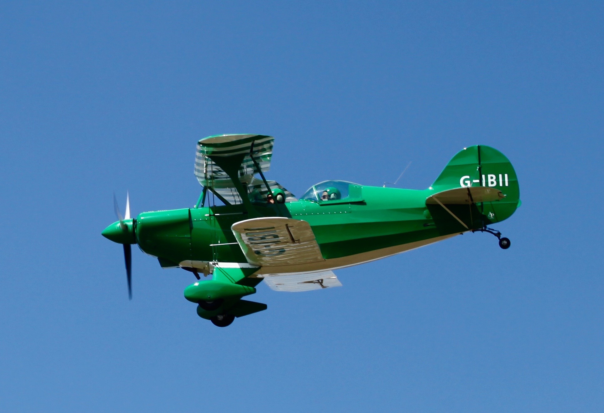 G-IBII is a factory built 1977 Pitts S2a. It has a fuel injected 200hp Lycoming AEIO-360 engine with inverted fuel and oil systems and a 3-blade MT constant speed propeller. The airframe is certified to +6 to -3G. With an all-up weight of only just over 3/4 ton, the power to weight ratio is impressive, and despite the higher drag from a biplane configuration, it’s small size allows a cruising speed of 140mph. The wing section is symmetrical which allows easy inverted flight.